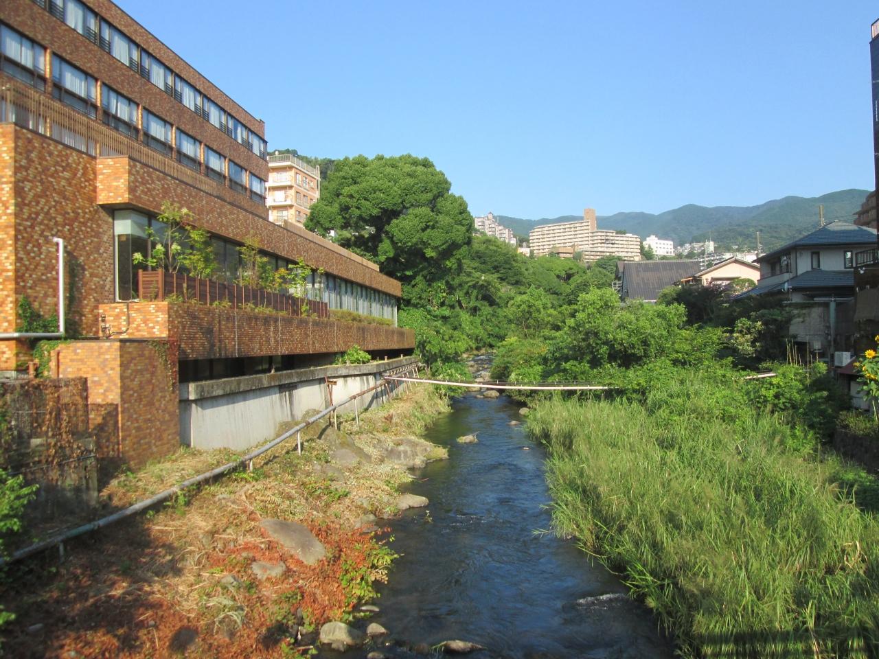ニューウェルシティ湯河原の玄関前、千歳川が境で道路側が神奈川県湯河原町、ホテル側が静岡県熱海市