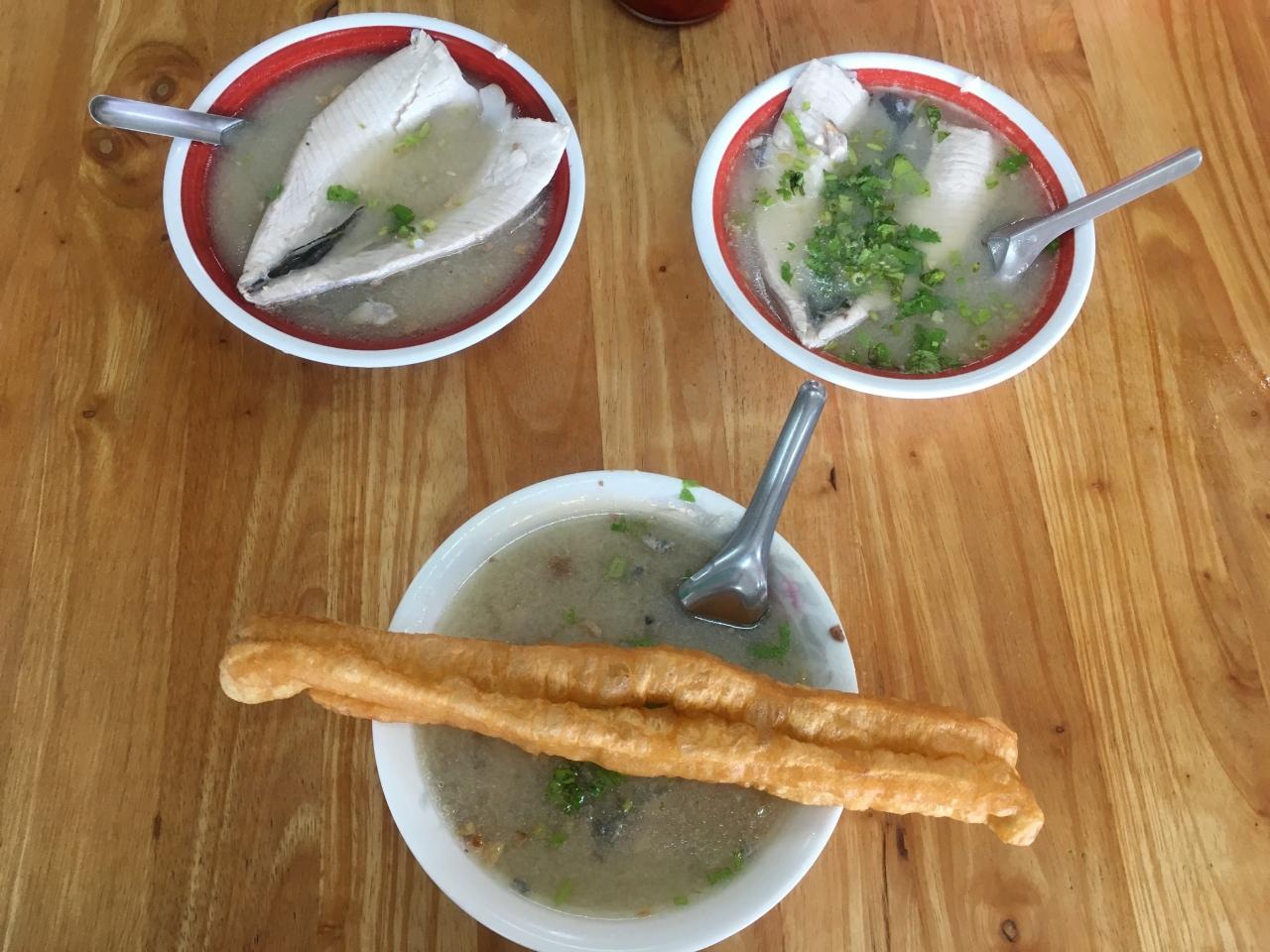 この日の朝食は、サバヒーの腹のお粥(120台湾ドル)と油條(10台湾ドル)という細長い揚げパンです。美味しくて、腹持ちも良かったです。