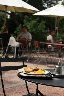 ちょっと休みたいな〜、何か飲みたいな〜、ブルーベリータルトみたいなの食べたいな〜、と思いつつ歩いていると、奥のほうからおしゃべりする声と食器の音が。「カフェだ〜!!」(・∀・)