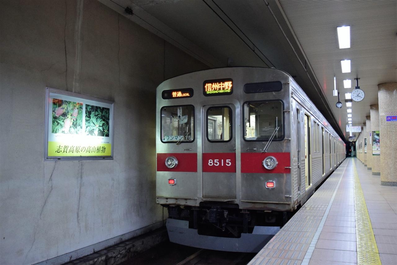 須坂駅には赤ラインの無い元営団3000系。
