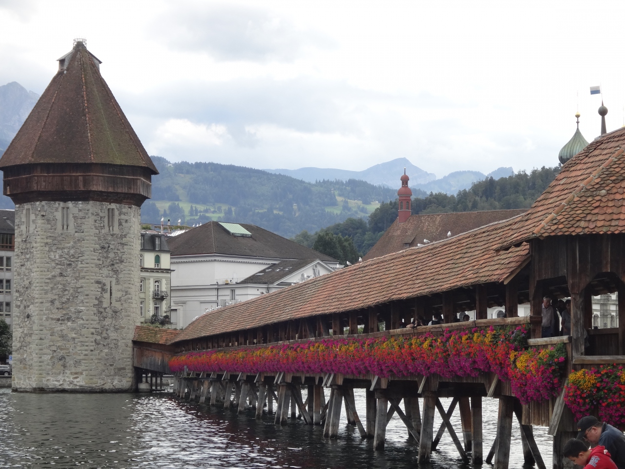 ルツェルンのシンボルである「カぺル橋」は花で飾られた木造の橋。もともとはヨーロッパで一番古いものだったらしいが、1993年に火災でかなりの部分が焼けてしまったとのことで、現在の橋は再建されたもの。