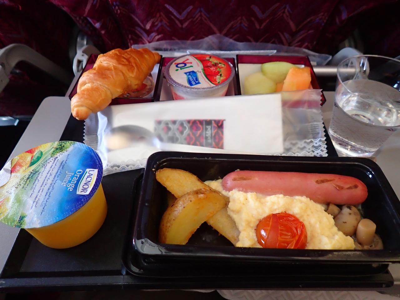 ドーハからナイロビへの飛行機では、離陸後に機内食、着陸前に軽食でした。写真は機内食のオムレツとソーセージ。結構まずかったです(笑)