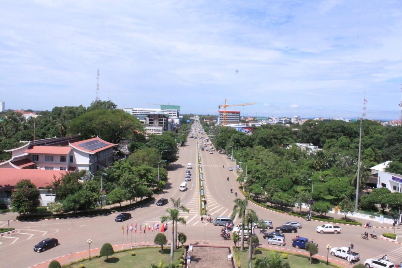 整備されたビエンチャンの町が見渡せます。通りのどんつきは迎賓館(ホワイトハウスと呼ばれる)。 -