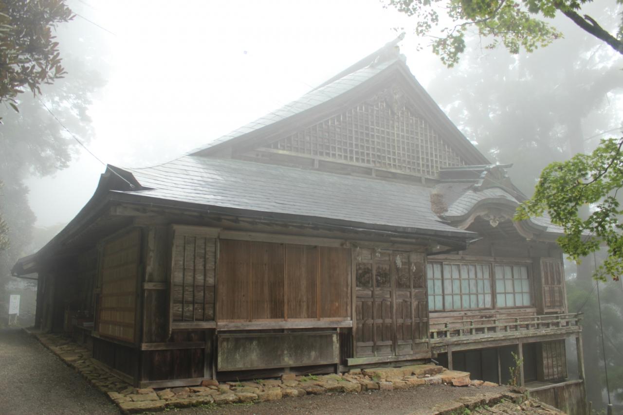 十津川温泉から30分ほど、つづら折りが続く1,2車線の山道を登っていき、やってきた玉置(たまき)神社は深い霧に包まれていました。駐車場には他の観光客の車や観光バスも停まっており、番組を見るまでは知りませんでしたが、十津川村では主要な観光スポットの一つのようです。