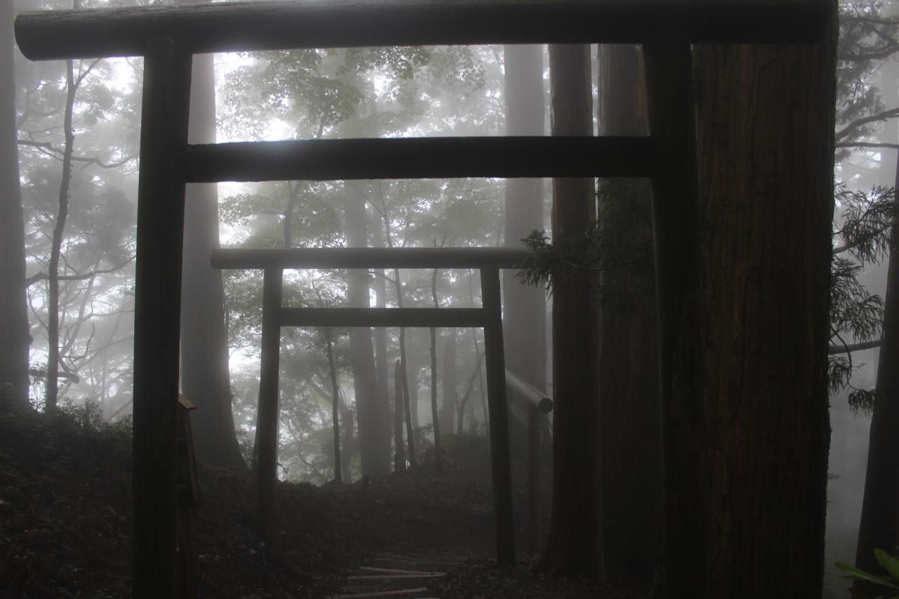 霧がかかって神秘的な雰囲気さえ漂っています。途中の道には熊野本宮へと向かう山道も分岐しており、大昔から修験者らは人一人通るのがやっとの道を駆け巡って山から山へ、寺社を巡っていたと考えると大層なことだと感じます。