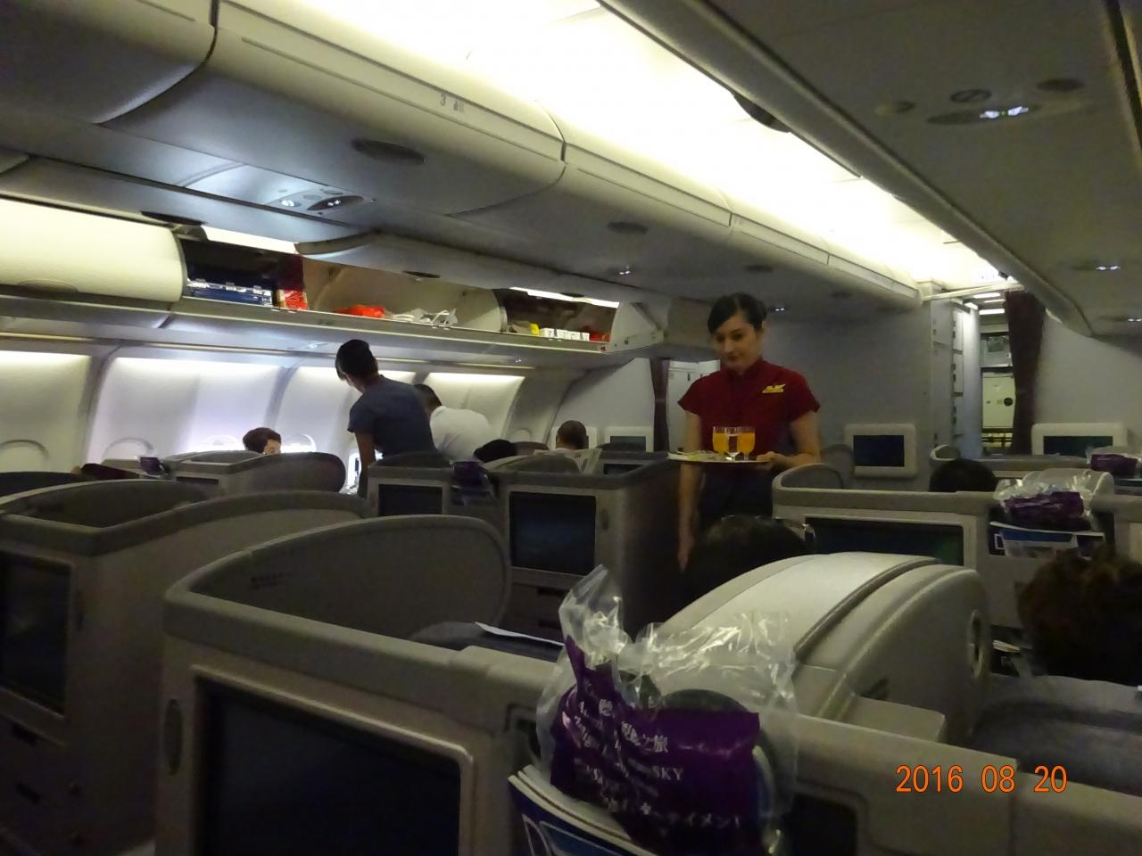 搭乗を待っていたところ、搭乗口に呼び出される。予約の際登録したパスポート番号が間違っていたのかと恐る恐る「何か問題ありましたか?」と尋ねたところ「本日は満席となっておりまして、ビジネスクラスへ移っていただきます」とのこと。超ラッキー!!幸先よいスタートです。