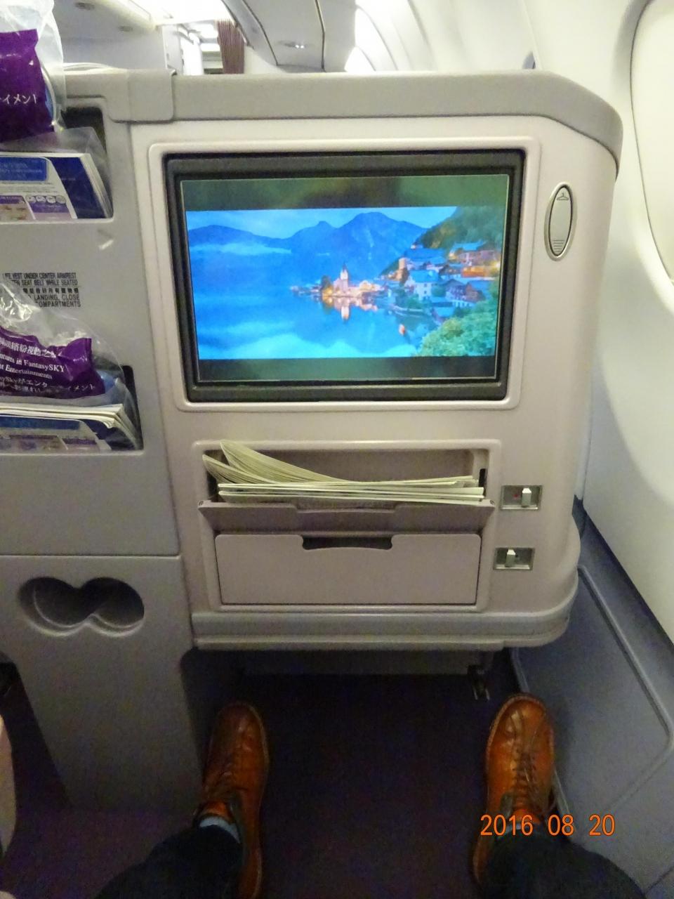 ビジネスクラスの座席。最新機と比べると見劣りしますが、座席はフルフラットにもできる広さ。