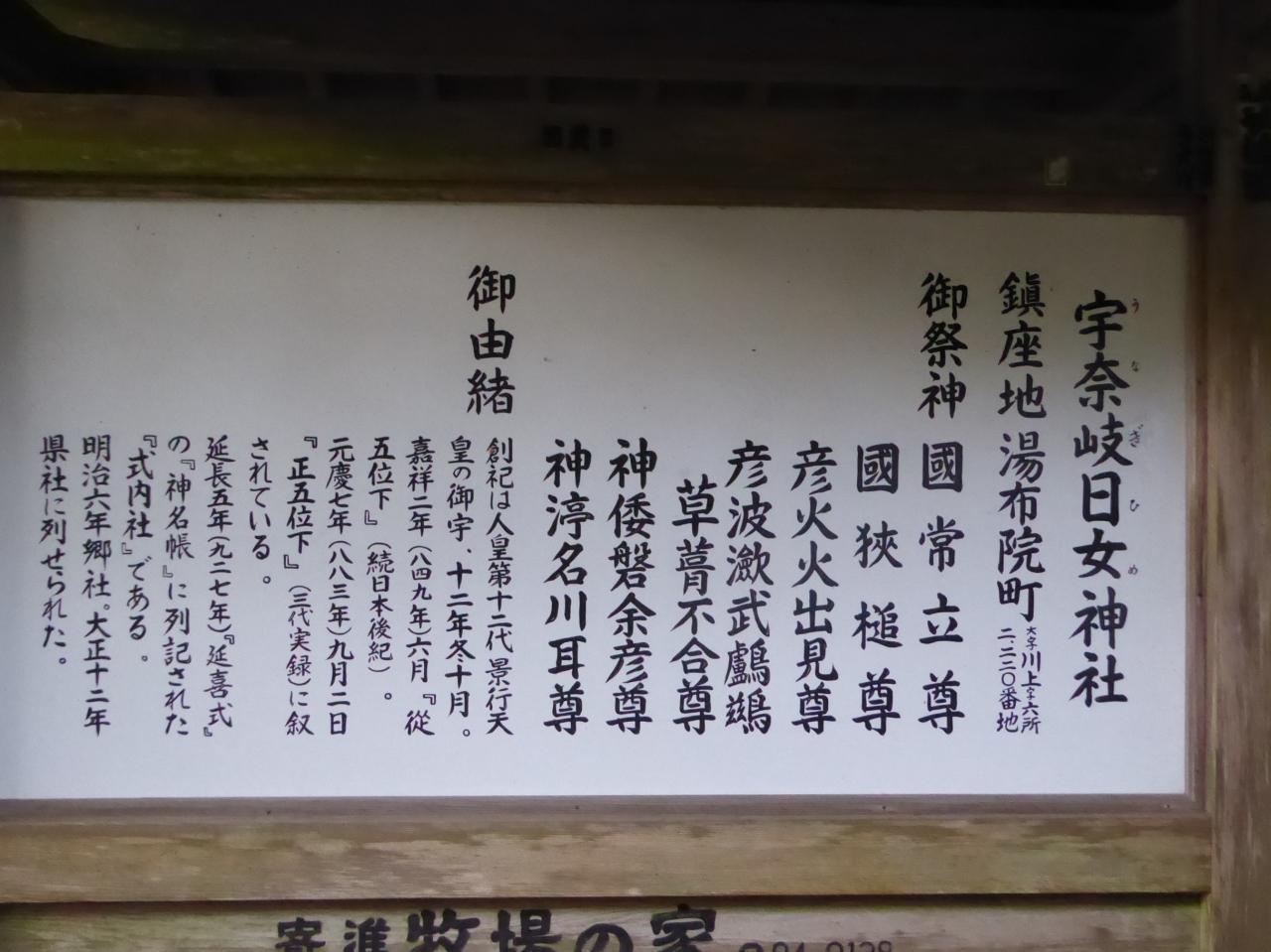 湯布院の人に「六所さん」と親しまれている氏神様・「六所宮」の名称は、現在のご祭神が六柱からなることに依るが、本来の名前は宇奈岐日女神社(うなぐひめじんじゃ/うなきひめ-/うなぎひめ-)。