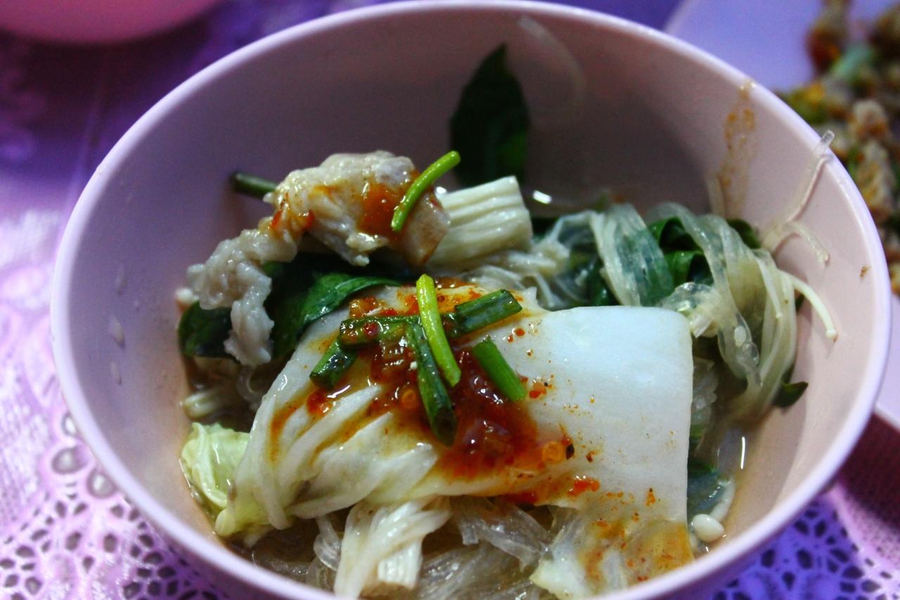 野菜は白菜、キャベツ、空芯菜、ドクダミ、エノキダケ、春雨が大量に供されてヘルシーである。