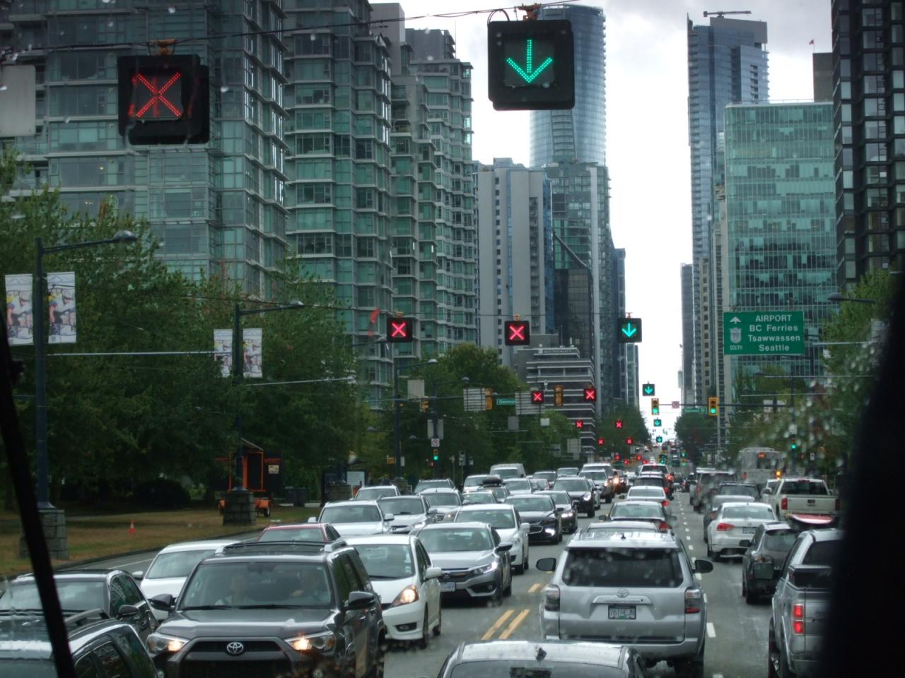 途中スコーミッシュにより、バンクーバー市内に入りました。市内はかなりの渋滞。道路の上に矢印とバツが書いてあるのは、時間帯によって車線を変更するから?
