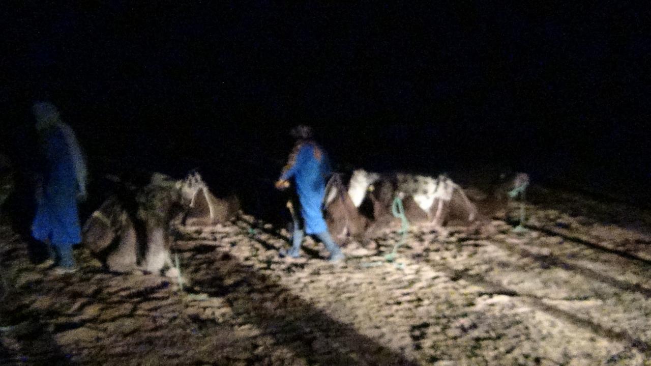 サハラ砂漠の日の出(我々が乗ってきたラクダさんで、3頭の名前はそれぞれ、アミラッダ アズゴッル アドフィニーです。)
