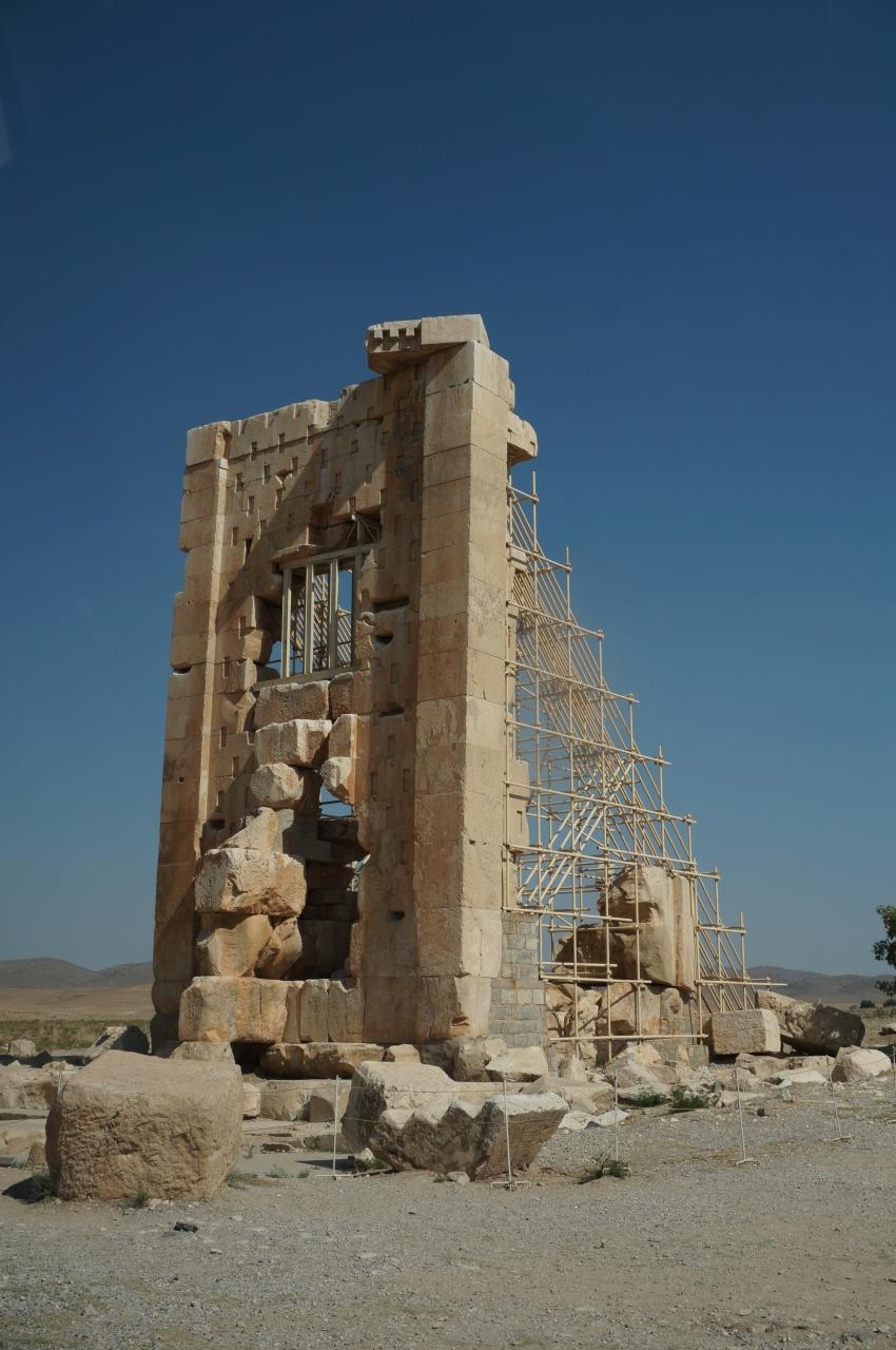 ナグシェ・ロスタムを出てパサルガダエに来ました。キュロス2世のお墓です。先ほどの岩山に彫刻するスタイルとは異なり、ピラミッド型に石が積み上げられています。