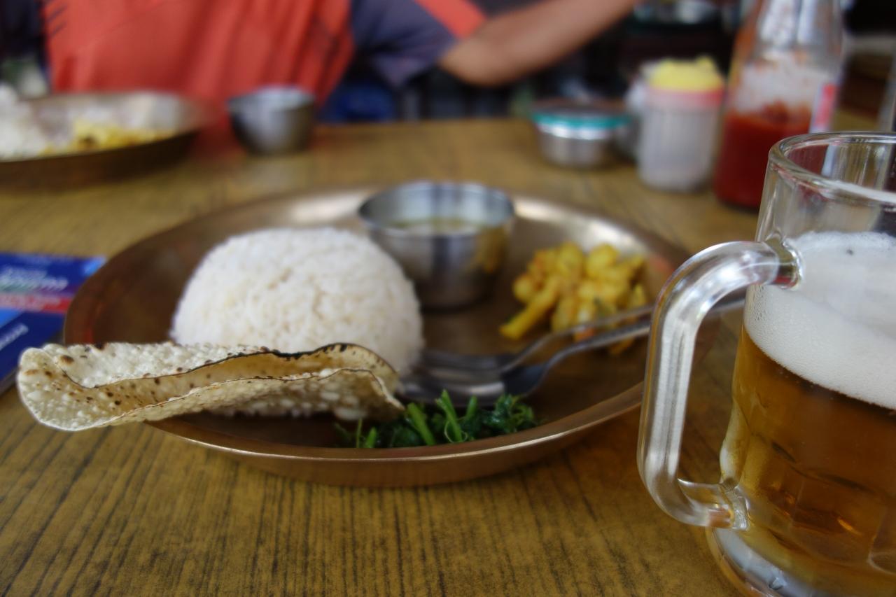 ダルバート、ビールとミネラルウォーターで920ルピー(920円)。 -