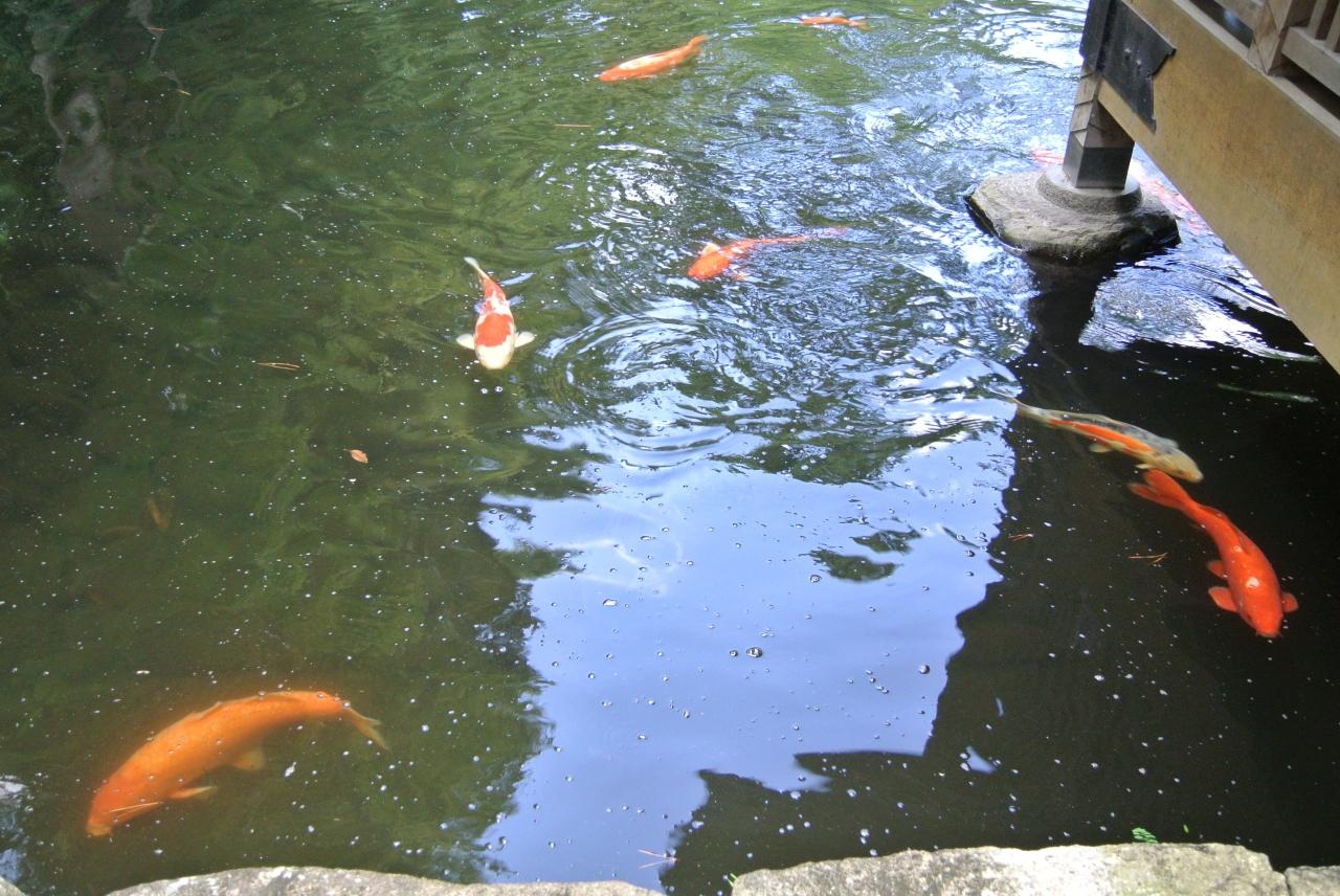 池で泳ぐ鯉は新潟県小千谷市から寄贈されたものです。