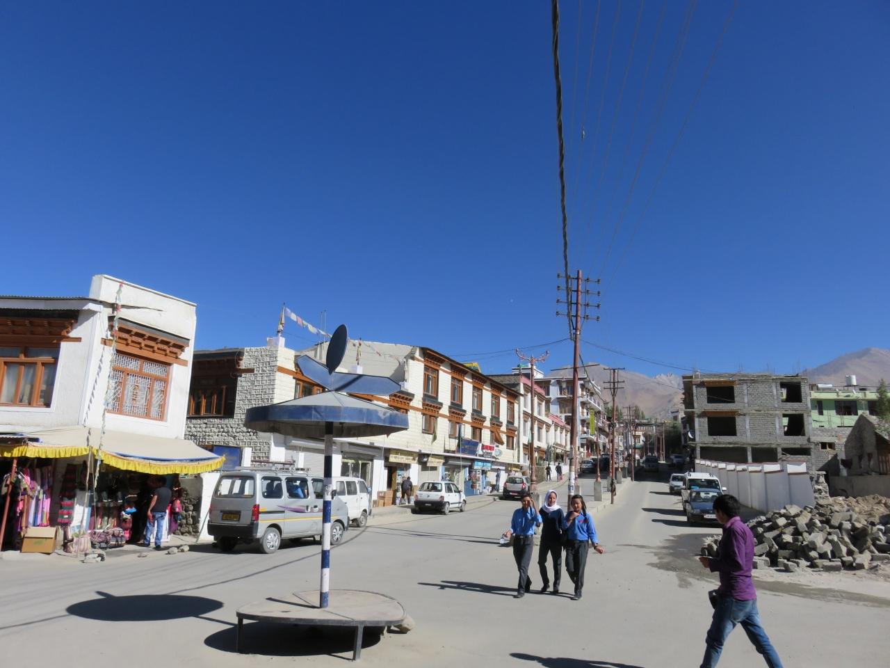 メイン通りを東にニ本裏に入ると、舗装されていない道と、古い民家が並ぶ旧市街が広がる。山頂にはナムギャル・ツェモ・ゴンパ。