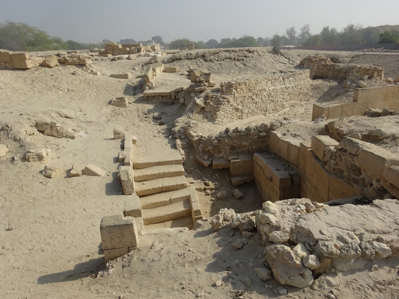 3)バルバル神殿(10:30-10:45)(主神殿(初期ディルムン時代の第1ー3期で井戸 水槽 階段 立石 囲暁地を見学) 北東神殿は埋められています。 日本大使館を通り、