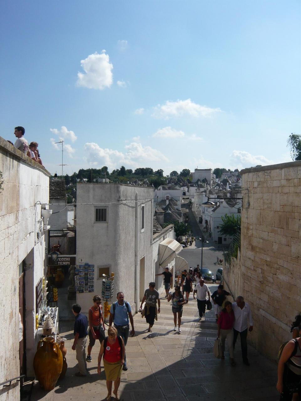 トゥルッリは今も住居として使われていて、散策していてもここで生活しているのねと思うと、不思議な気持ちと温かい気持ちになる。まずは、居住地エリアの高台から、白いとんがり屋根の家々を見下ろすために登っていく。