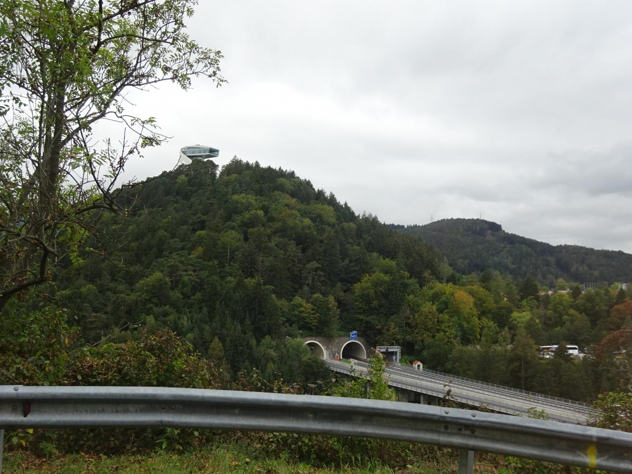 J番のバスはインスブルックの南に向かい、途中で丘の上にベイクイーゼル・ジャンプ台が見えました。