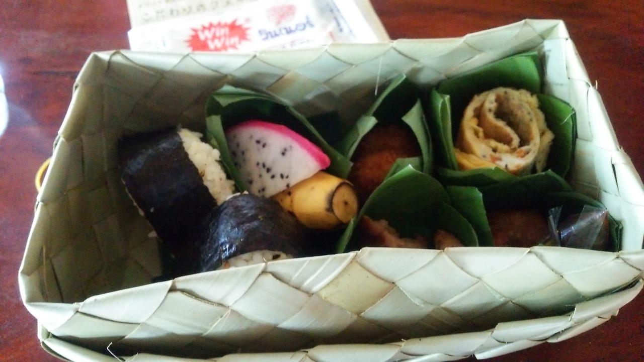 途中でバンから4WDに乗り換えるところでお弁当。以外に美味しい。 -