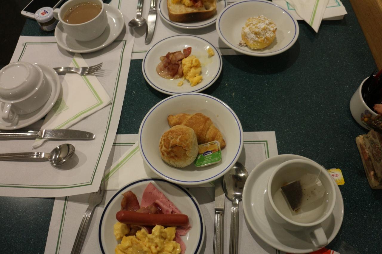 混雑しすぎて、コーヒーはないし、なんと皿までないのだ。しまいには小さなソーサーに無理やりパンを乗せている人もいたし、ロビー階から朝食会場に降りる階段に座っている人もいた。とてもじゃないが写真を撮れるようなブッフェ台ではなかった。 -