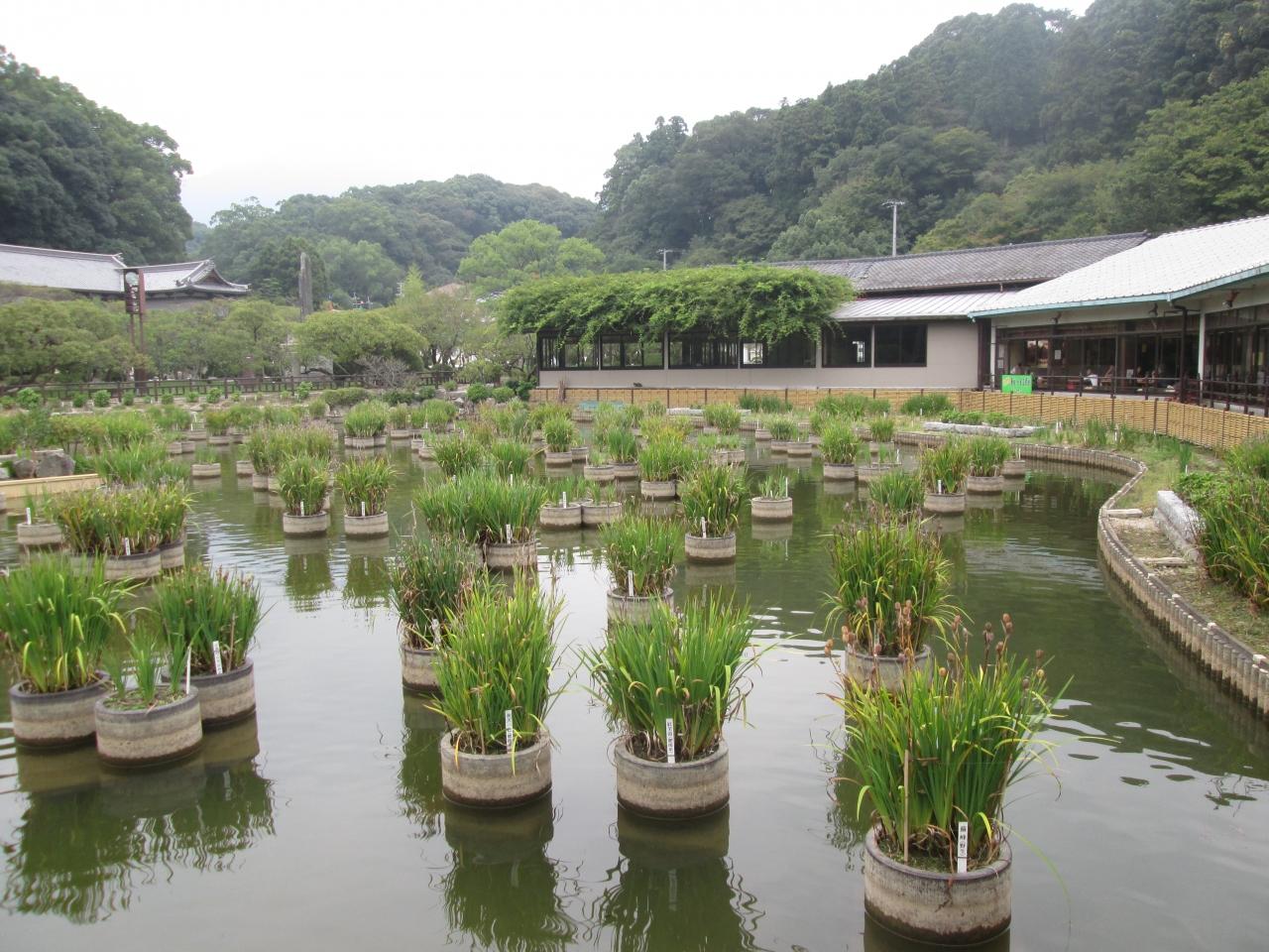 菖蒲池があり、湖畔に飲食店が並んでいます