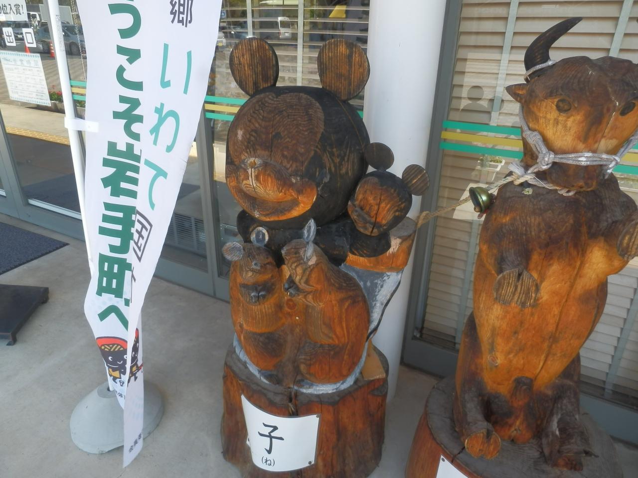 道の駅石神の丘に並ぶ十二支のチェーンソーアート.