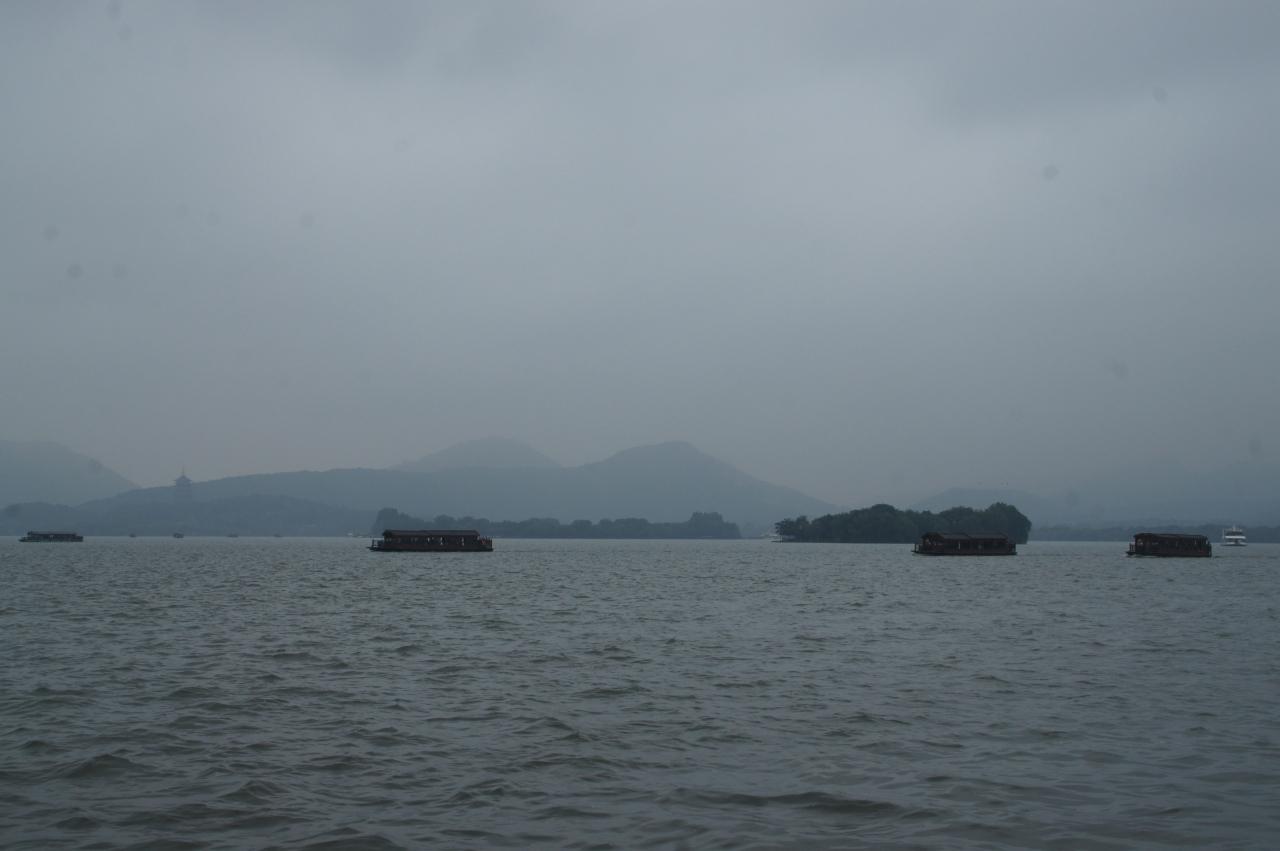 西湖に出ました。やっぱり烟ってますね。ま、まだ霧雨も降ってますし