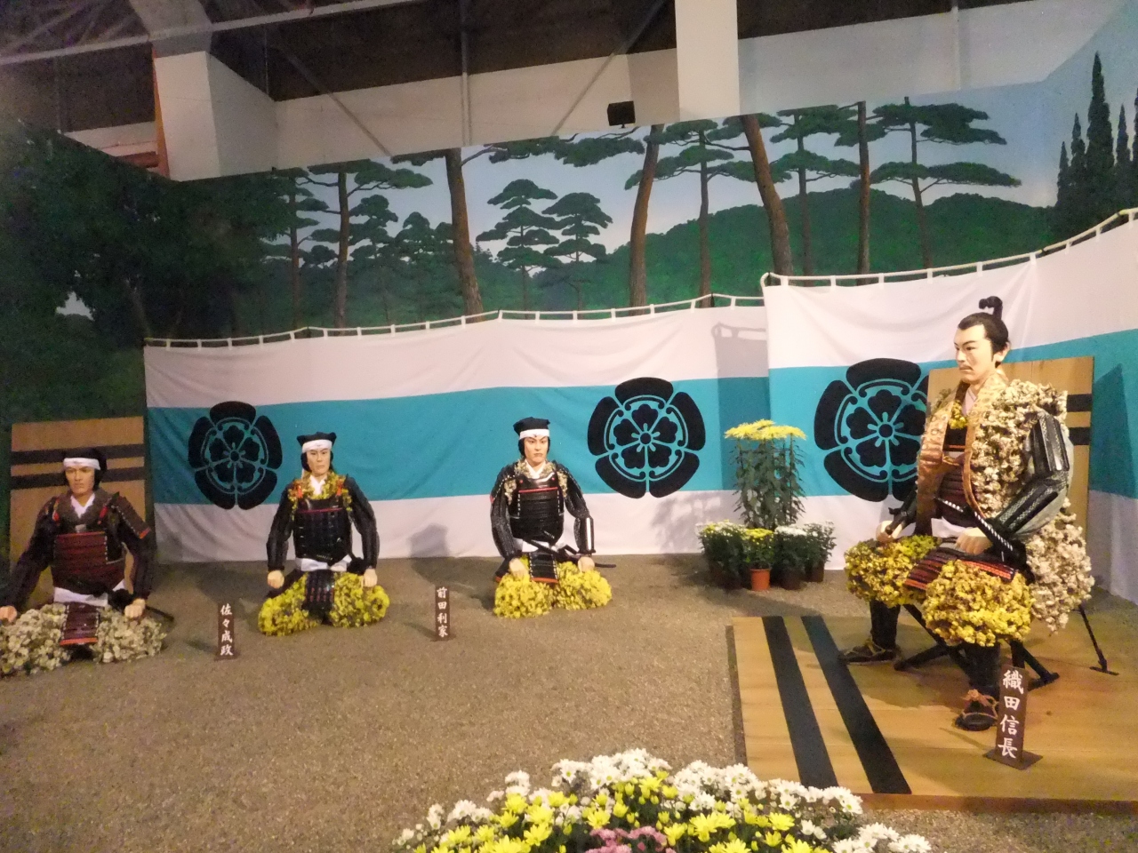 越前の歴史のいくつかのシーンが菊人形で再現されている。顔はもちろんマネキンで、骨組みも作られているが、衣服や体の部分は菊の花を組み合わせて作られている。花の色や、大きさ、咲き具合などを組み合わせて作成するので、よく考えてみたら奥が深い。