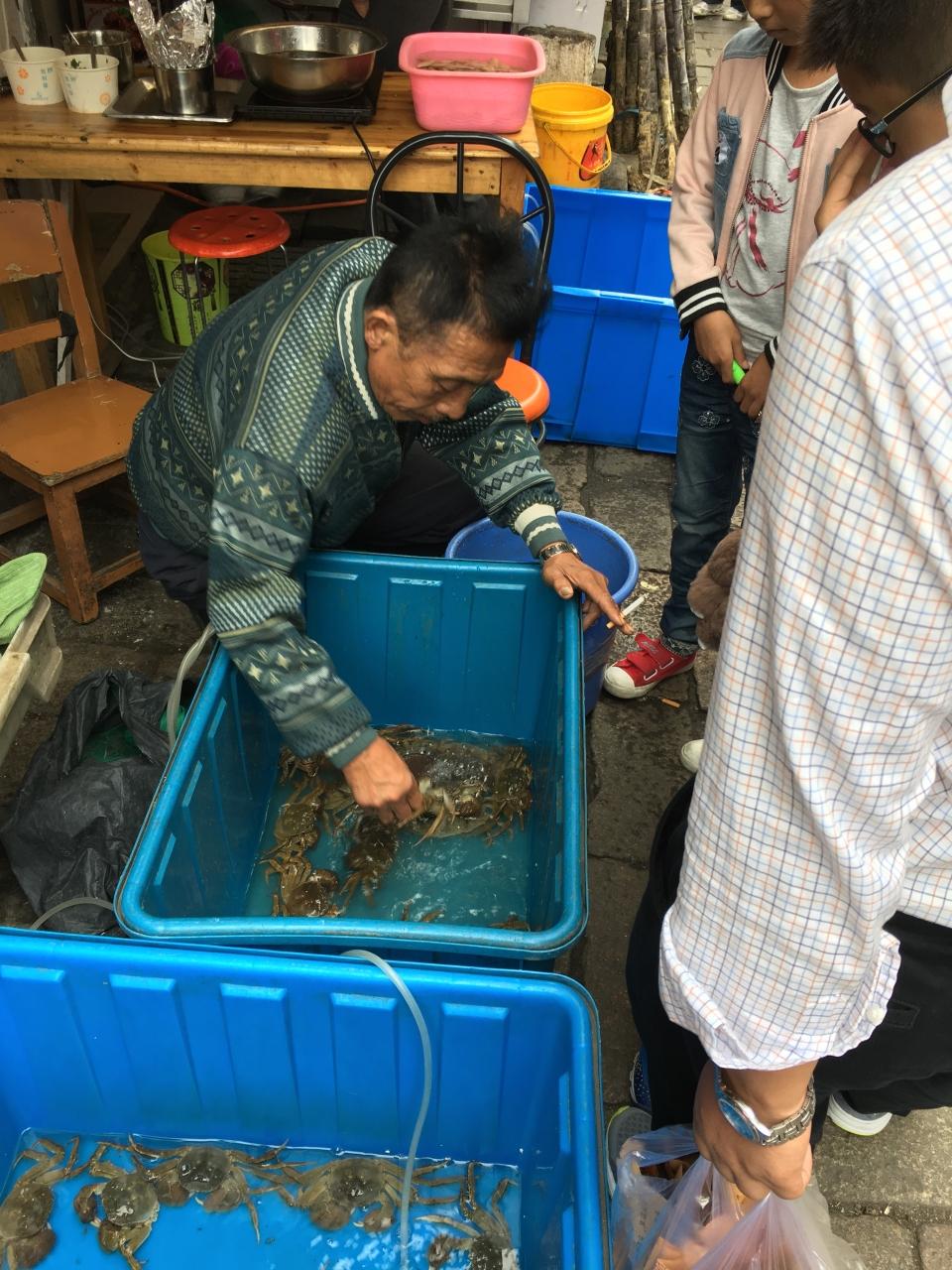 上海蟹を売ってます。その場で蒸してくれるようで、店の奥で食べれるようでした。