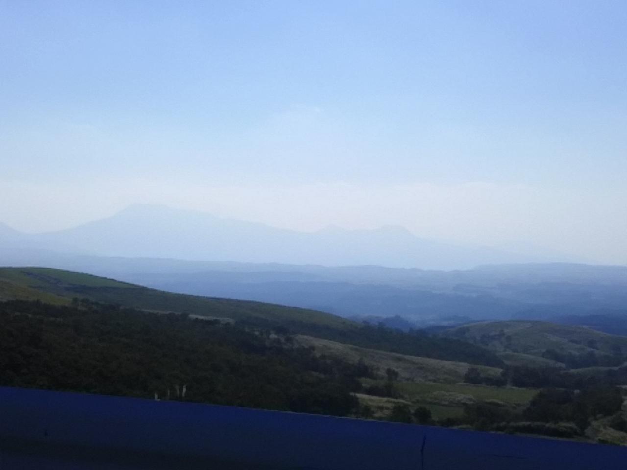 やまなみハイウェイから久住高原へ移動中に、うっすらと見える「阿蘇山(五岳)」をパチリ。