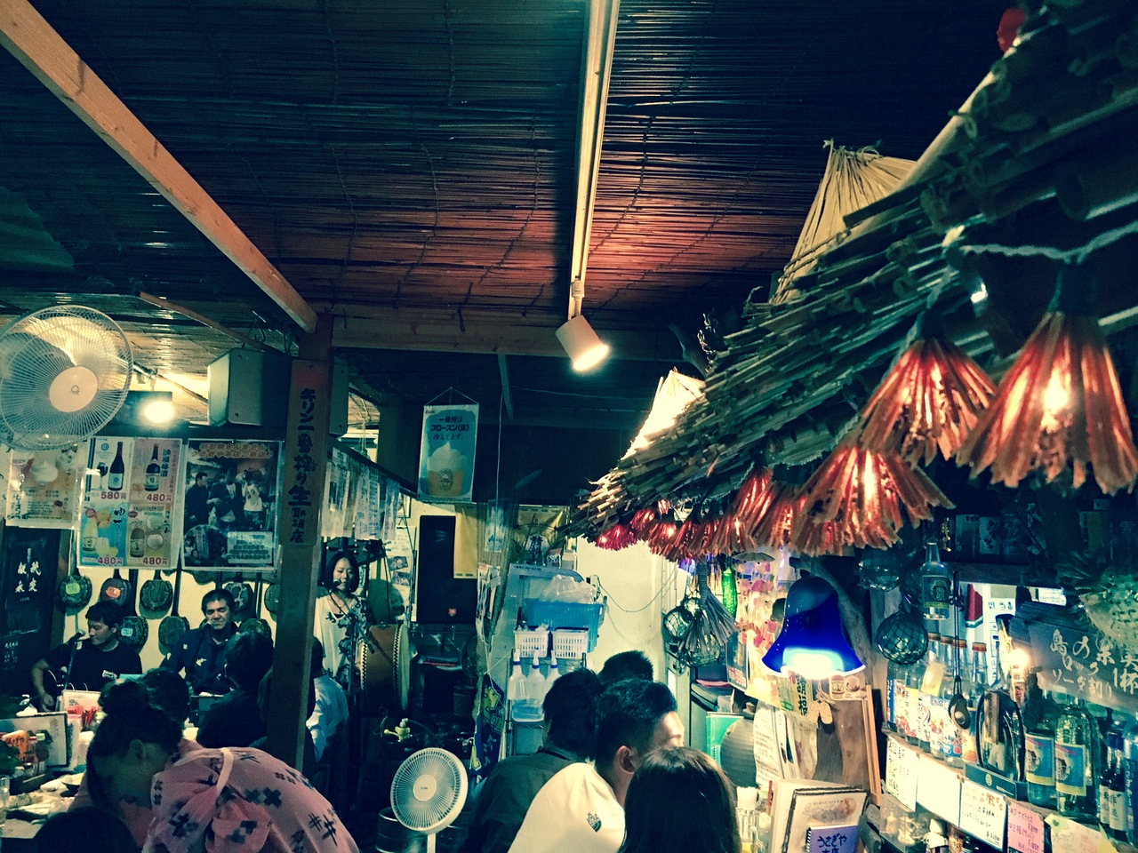 民謡居酒屋ですが、お客を巻き込んで、「アッリ乾杯!」とオジー自慢のオリオンビールやら、島人の宝などの演奏が楽しめます。1部と2部の間には、三線体験も出来るので、三線借りて、友人と歌ってました。