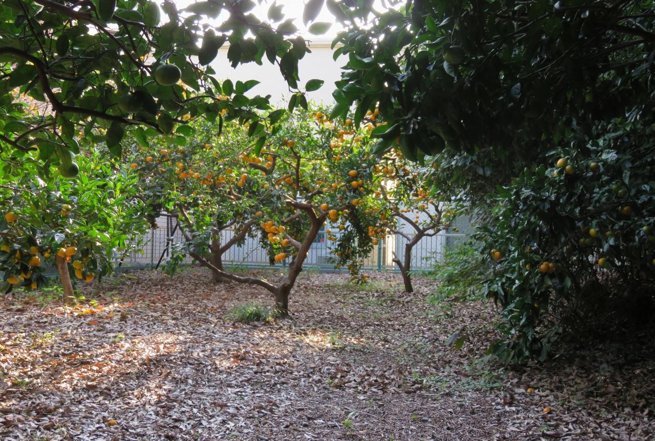 この日の散策で目にした季節を表す光景の紹介です。少しだけ緑色が残っていますが、黄色く色付いたミカンの光景です。生食用の甘い品種ではなく、味付け、香り付け用の酸っぱいミカンのようでした。通称、平針街道脇での撮影です。