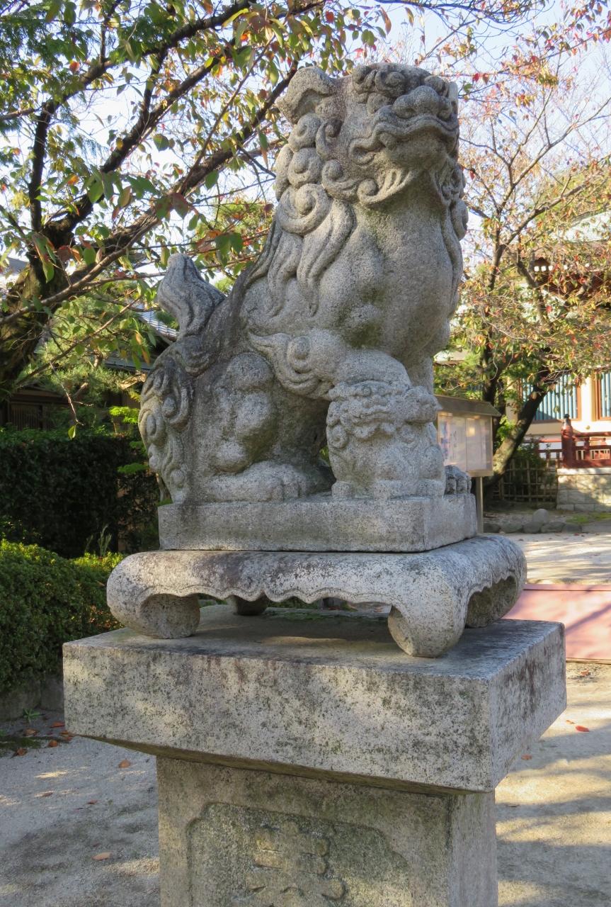 拝殿に向かって左側の吽形の雌獅子の光景です。右足の下に小獅子を抑え込んだ姿です。自信たっぷりの顔付きの雌獅子でしたが、脚の下の子獅子も根性がありそうな顔付きでした。
