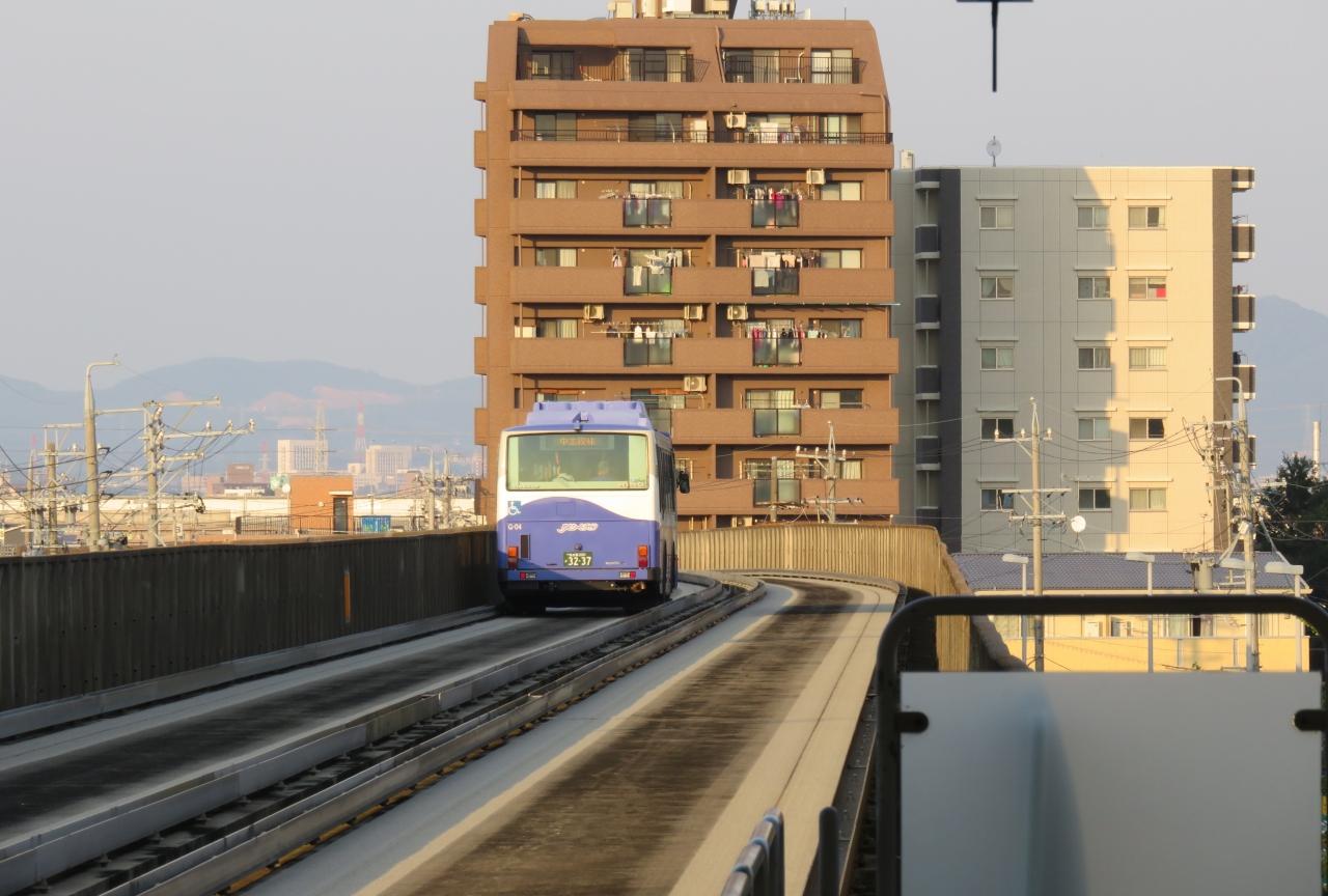 高架線路の上を走行する、ガイドウェイ・バスの光景です。軌条走行の効果から降りた後は、一般道路を普通のバスとして走行します。