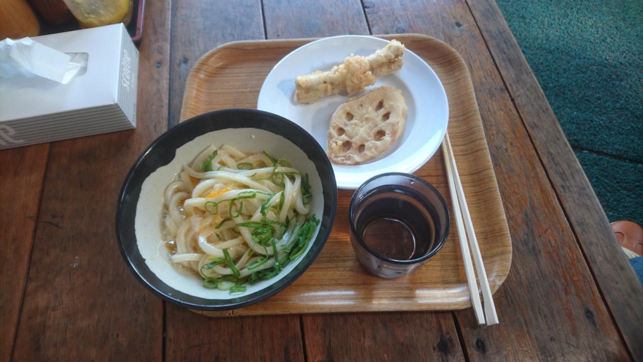 僕が頼んだのは釜玉うどんとごぼ天とれんこん天です。