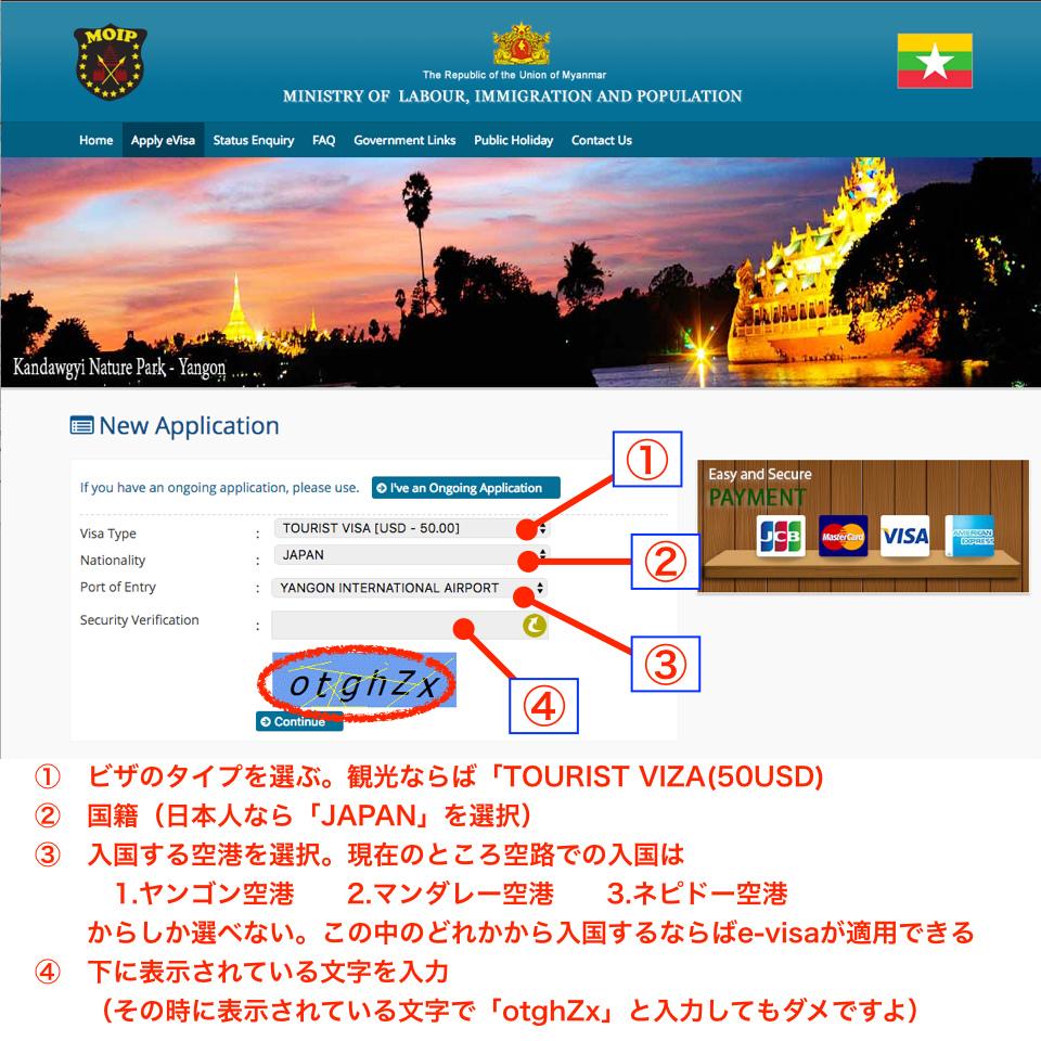 サイトにアクセスすると、こんな画面が出る。 まずは①の部分のビザタイプを選ぶ。今回は「TOURIST VISA」を選択。 50USドルかかる。 次に②の国籍を選択する。 そして③の入国する場所を選択する。 ヤンゴンから入国するならば、「YANGON INTERNATIONAL AIRPORT」を選択する。 最後に④のセキュリティー用の文字入力で、画面の下に出ているランダムな文字を入力する。 この画像には「otghZx」と出ているが、自分が申請する時に表示されている文字を入力しないとダメですよ。 -
