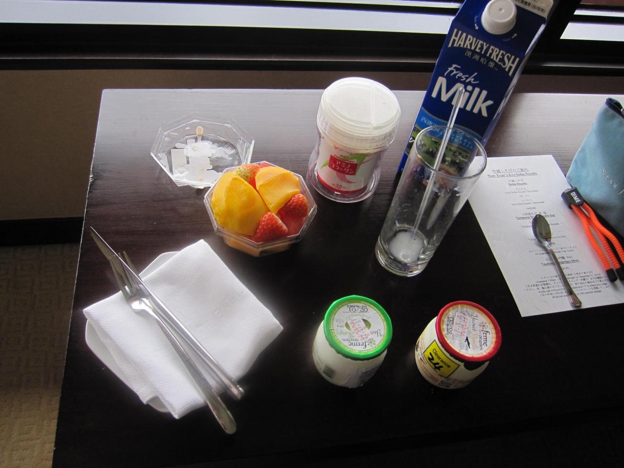 GREATで仕入れたカットフルーツに牛乳。ヨーグルトは30ドルのところ、消費期限切迫品が24ドルでした♪ -