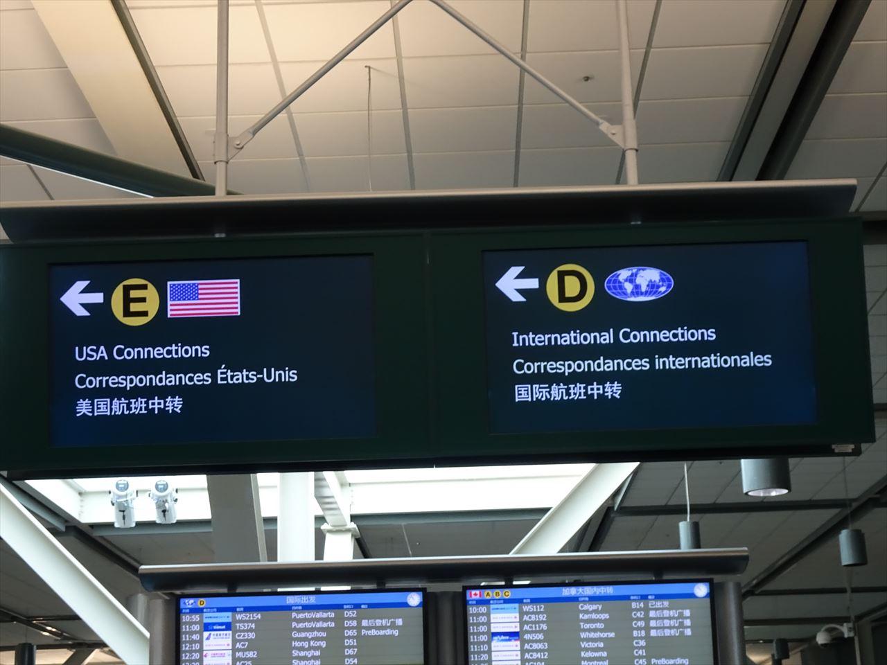 10時53分、「US Connections」と「International connections」の表示の通り左に曲がり、その後すぐに2つの分かれ道があったので、「International connections」の方に進むと人が立っていて、カナダ入国カードをチェック。ない人はカードを渡されて別の場所で記入します。カードを持っていたので審査に進み、パスポートと航空券と入国カードを提示。その後セキュリティチェックを受け階段を下りると、ゲートのあるフロアでした。