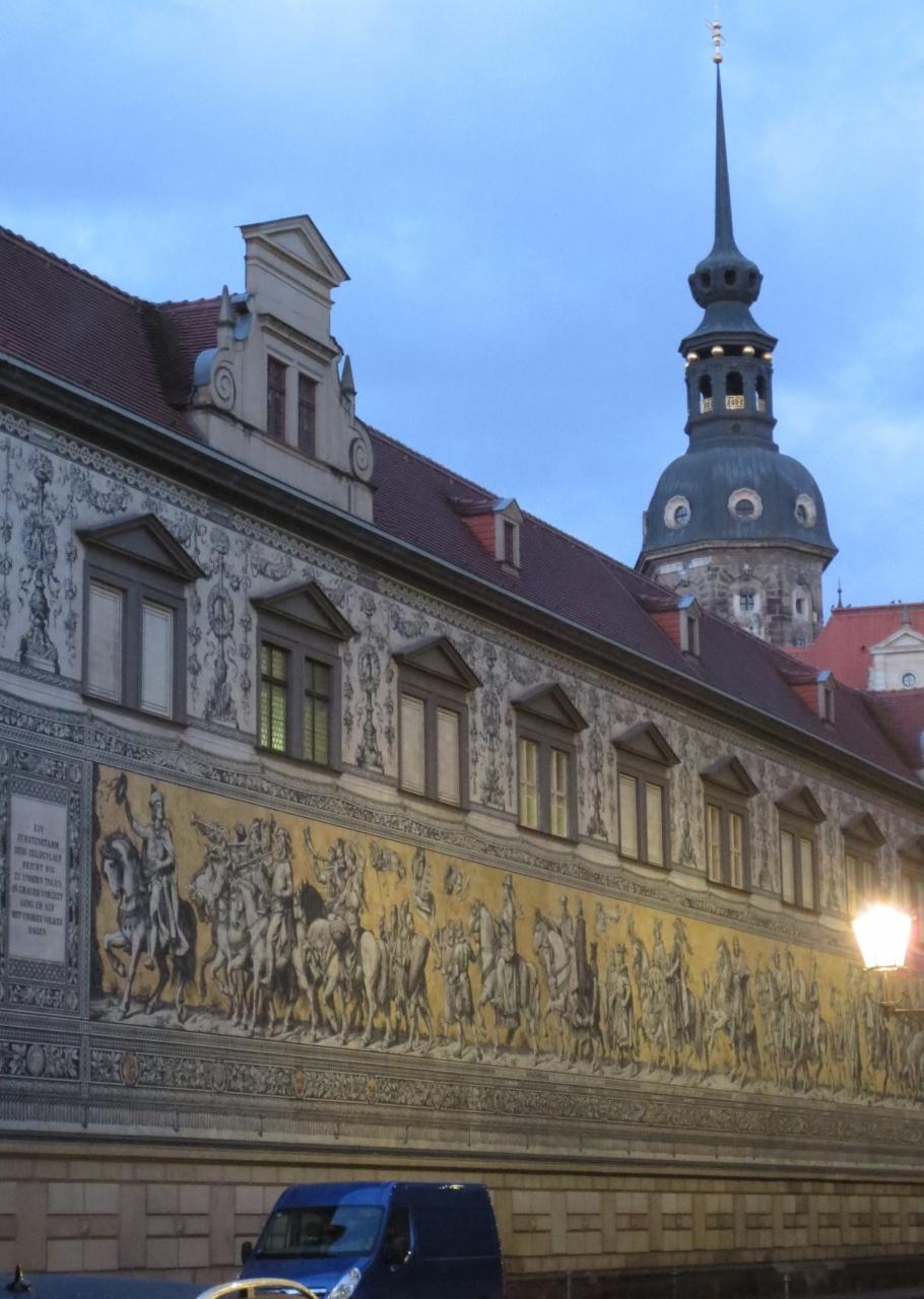 長さ101.9m×高さ10.5m、マイセンタイルは24000枚以上も使用されているようです。行列には35人の王を主役に総勢93名が描かれています。 -