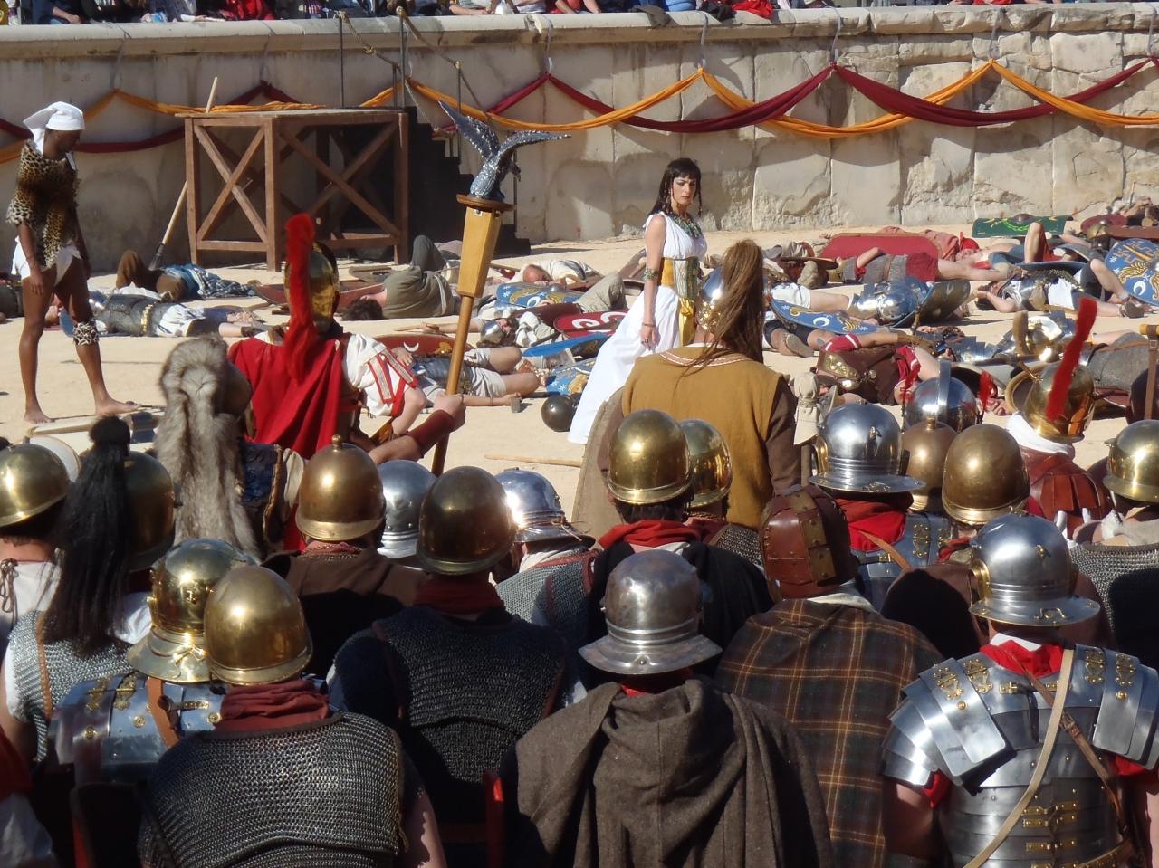 軍団がまた集まってきたと思ったらフィナーレ、参加者の紹介のようだ。主役級やアクションは別にして、軍団などはニームの人たちが演じていたようだ。観客から盛大な拍手を受けていた。 -