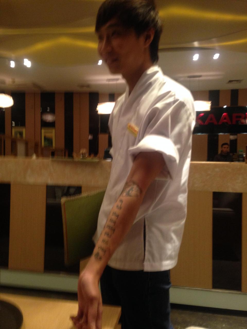 日本食のレストラン。日本語ができる板前さん。入れ墨は、お父さんお母さんへの感謝の言葉が彫られているそうです。