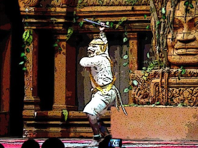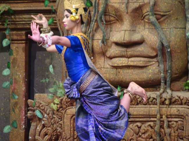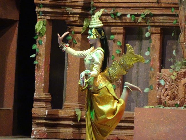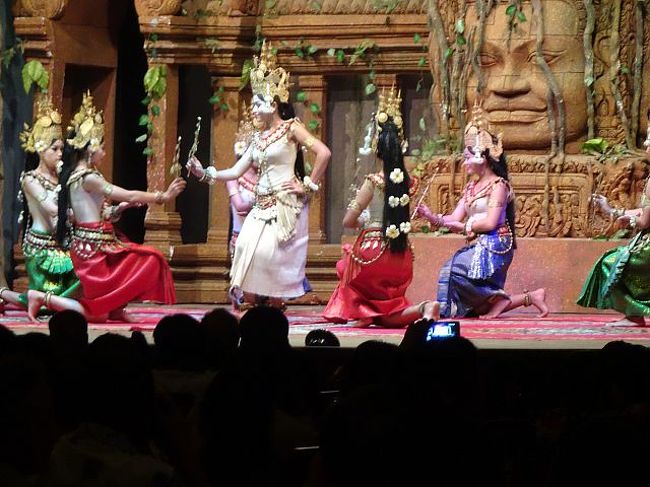 後ろの方の席だったので、踊りもよく見えませんでした。でも、ズームを使って何とか撮影した写真や、写真の一部を拡大したものなどを後で見てみると、一通りのアプサラの踊りを見ることはできたようです。アプサラというのは9世紀ころに生まれた宮廷の踊りで、アンコールの遺跡にもレリーフとして描かれています。