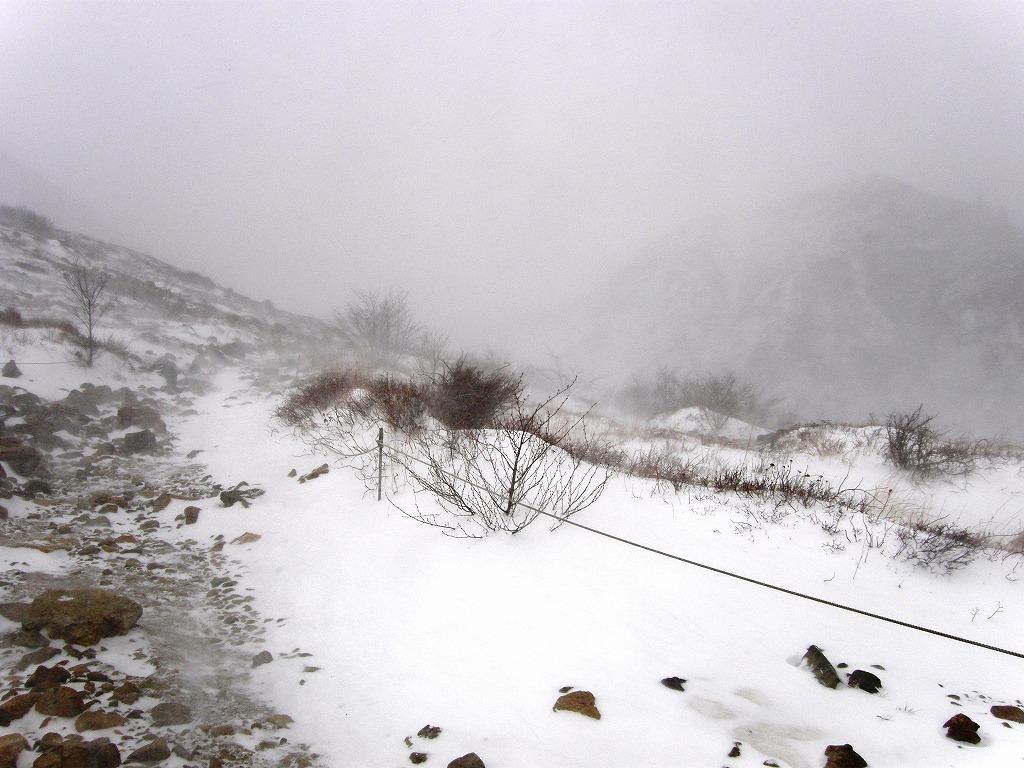 この辺の登山道は強風に飛ばされ雪が付きません。