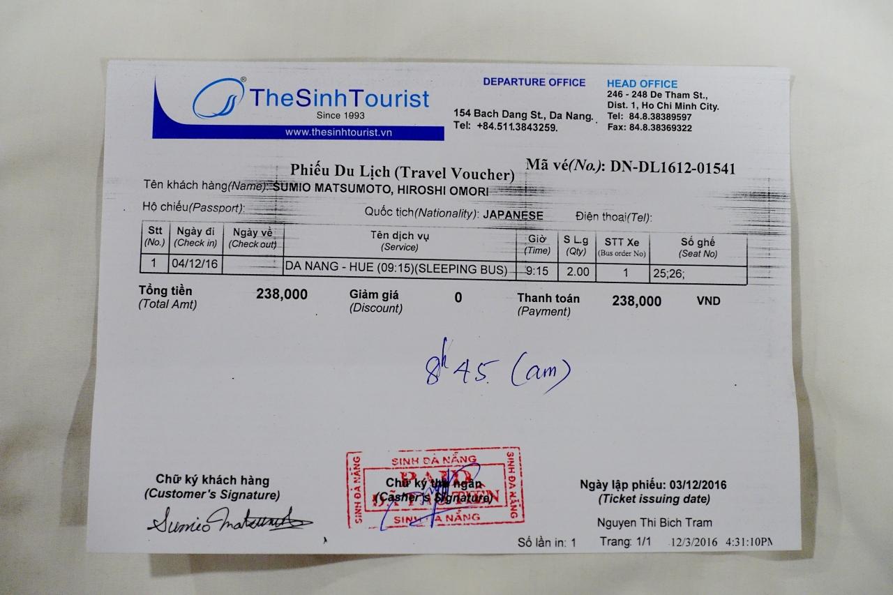 ダナンのシンツーリストでスリーピングバスを予約しフエに移動しました。