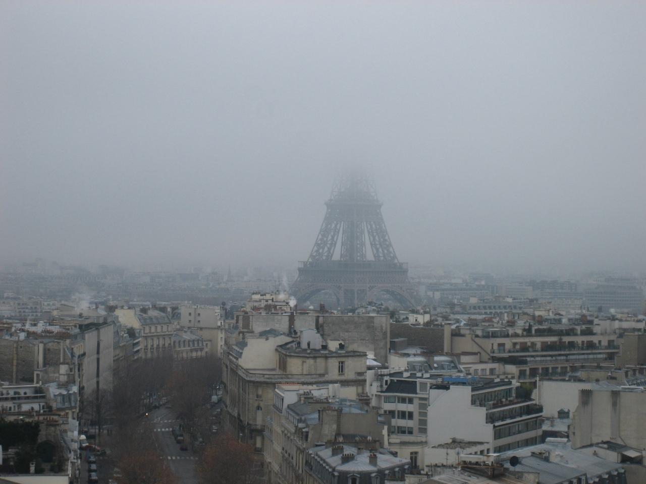 凱旋門の屋上から。霧のおかげでエッフェル塔の頂上が見えません。