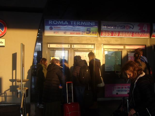 FCOから市街地までは数社のバスが運行されていて、会社毎に微妙に料金が違っていたりします。私の出発した時間帯の間近出発はこちらの会社でしたが、料金は片道だと5.9ユーロとやや高め。往復だと7.9ユーロとのことで、かなりお得になるので迷いましたが、復路でこの会社のバスしか利用できないとなると、どうせ自分のことですから、最後も追われての空港行きとなるでしょうから、その時間帯にバスがない、等のリスクがありそうです。なので、ここは仕方なく片道で購入しました。