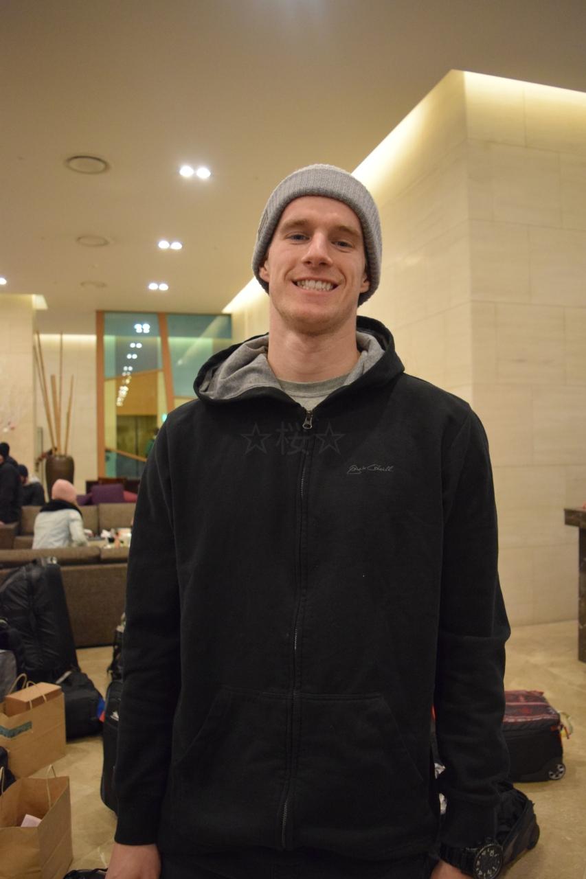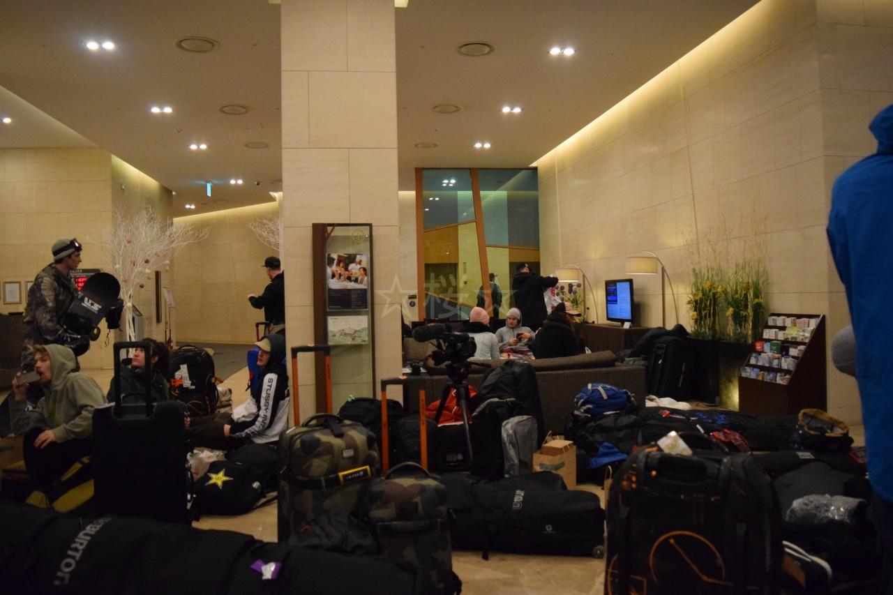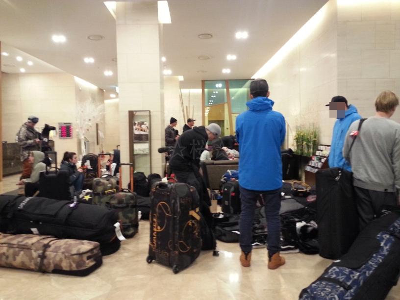 スノーボードのワールドカップを観戦したアルペンシアリゾートに戻ってきたところ、ちょうど競技を終えてリラックスしている選手たちの一行にばったり!