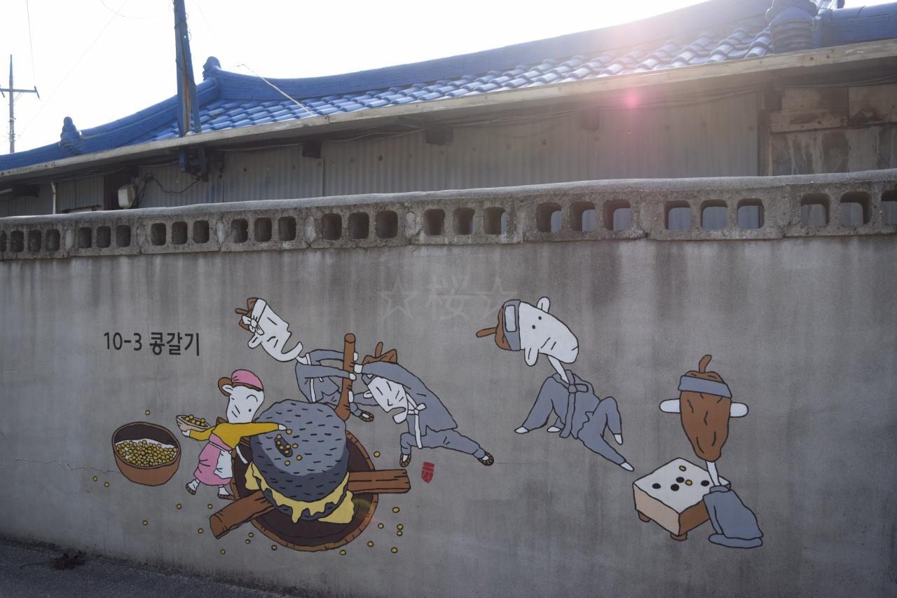 スンドゥブの有名な場所ということで、スンドゥブが出来るまでを紹介する壁画があちこちに……