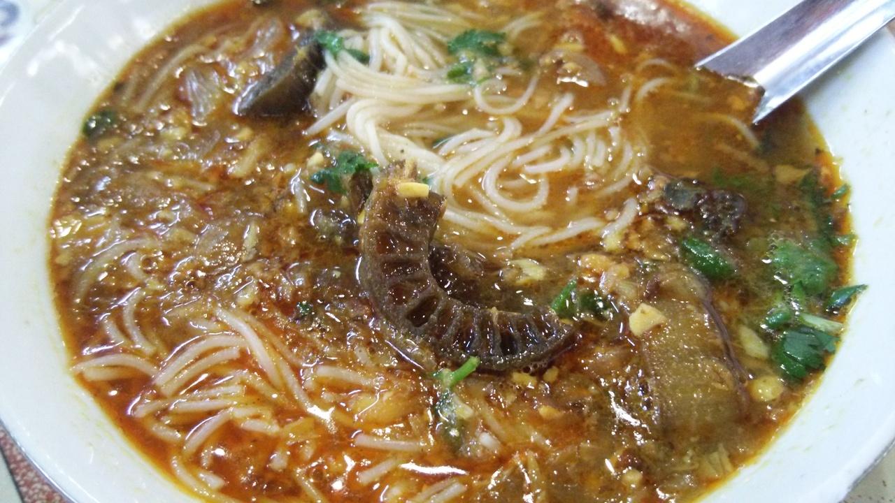 ちょうど町を出る出口の橋を渡ったたもとにあった屋台でシャンヌードルを食べた。