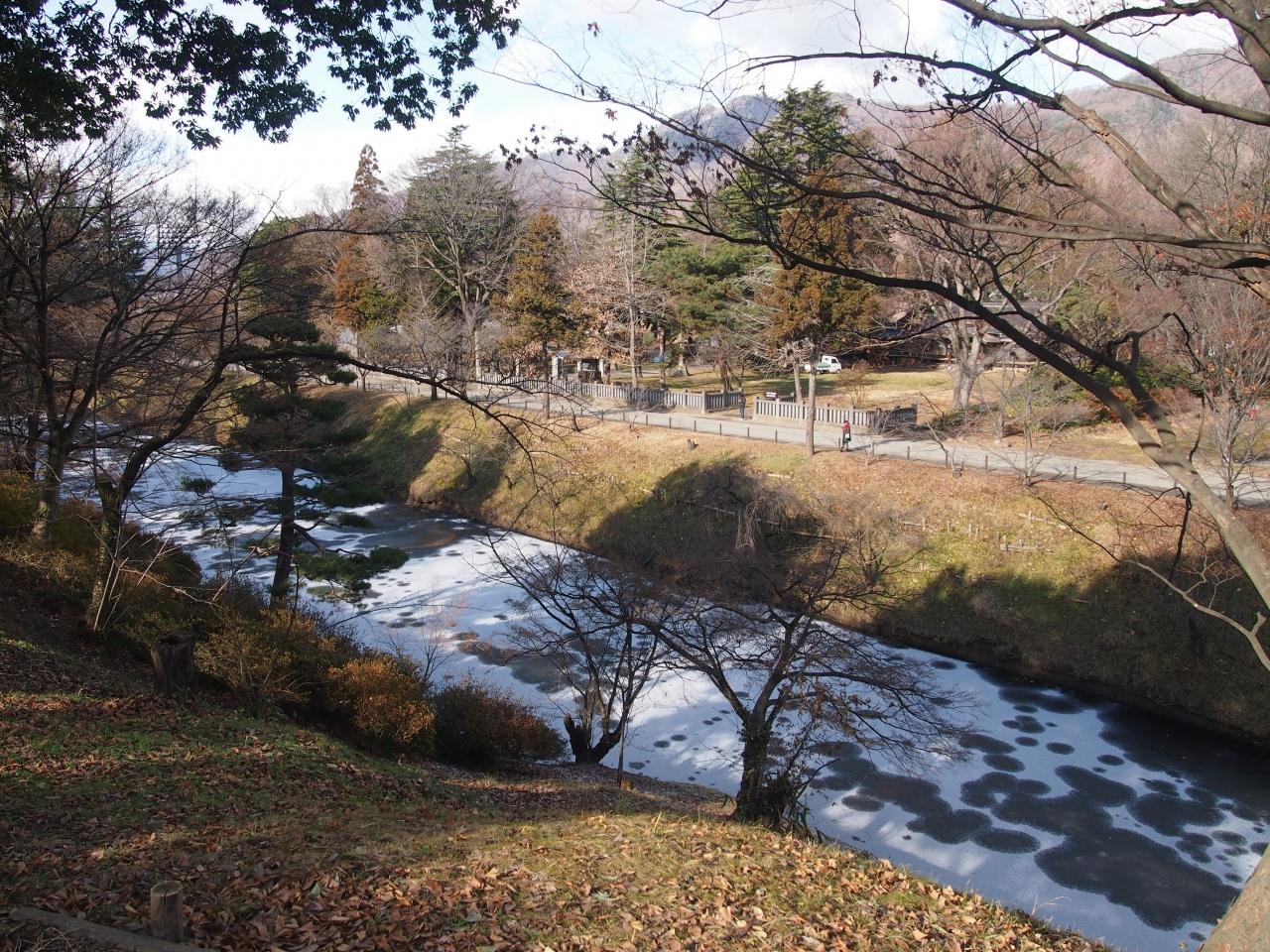 お堀には今朝降った雪が残っていました